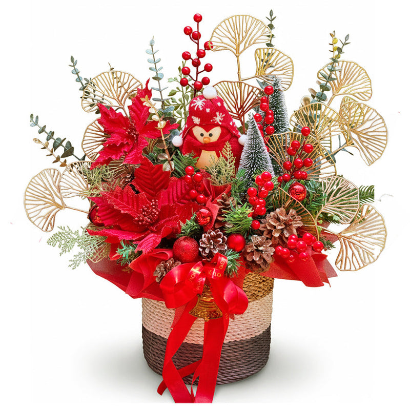 Hadirkan kehangatan dan keajaiban pada suasana liburan Anda dengan Tree Hollow. Keranjang bergaya rustic ini menampilkan komposisi buah pinus, tanaman hijau frosted, dan dedaunan meriah yang memikat mata, ditambah figur burung hantu lucu yang memberikan sentuhan whimsical sekaligus elegan. Setiap elemen ditata dengan penuh perhatian untuk menciptakan nuansa musim dingin yang hangat namun berkelas. Jadikan ini centerpiece yang memukau atau hadiah istimewa yang akan dikenang!