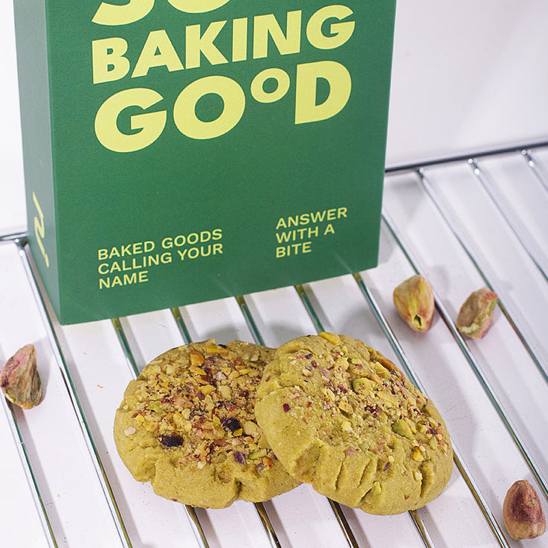 - Kukis Premium dengan Paduan Matcha Lembut, Kacang Pistachio, dan White Chocolate Chip