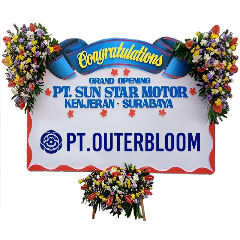 Papan Bunga ini cocok diberikan untuk berbagai kesempatan dan acara kepada kerabat atau rekan Anda. Tersedia dalam ukuran 200 cm x 125 cm. Hadir dengan varian rangkaian bunga fresh dan suyok serta dilengkapi dengan penyangga yang kokoh.