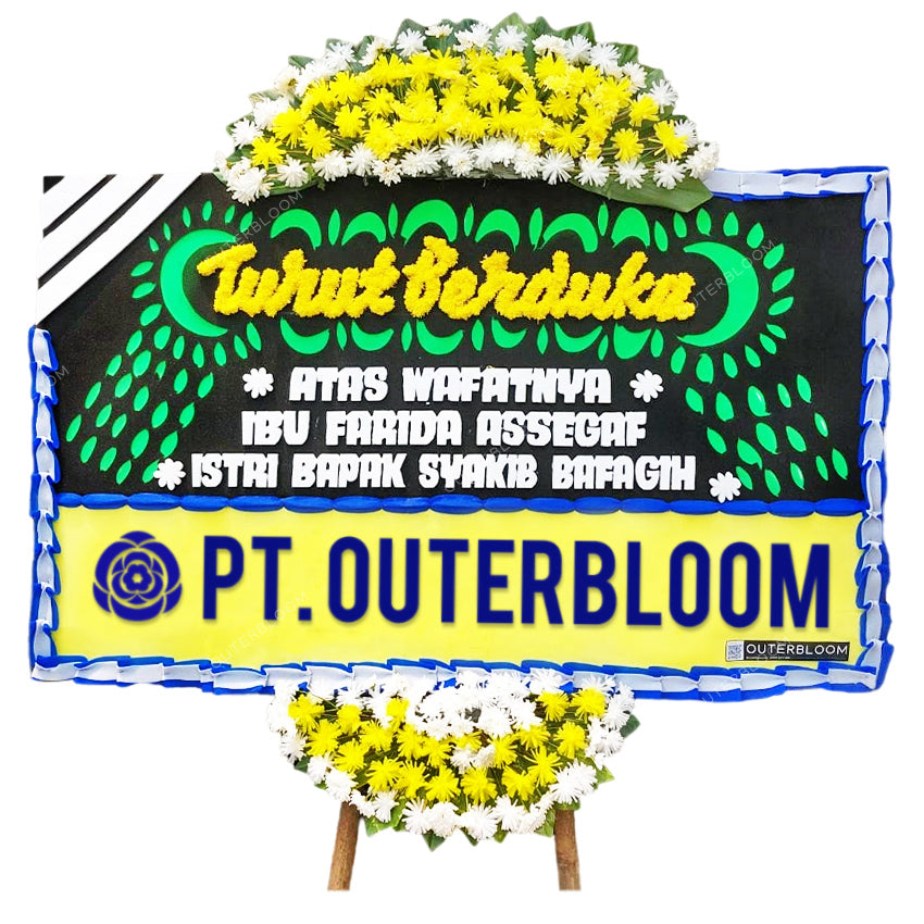 Papan Bunga ini cocok diberikan kepada kerabat atau rekan terdekat Anda yang sedang berkabung ataupun berduka cita. Tersedia dalam ukuran 200 cm x 125 cm. Hadir dengan varian rangkaian bunga fresh yang terletak di dua titik, yaitu: bagian atas dan bawah papan bunga. Pada bagian pinggir papan dikelilingi dengan list busa dan suyok berkualitas untuk menulis ucapan seperti "Turut Berduka Cita".