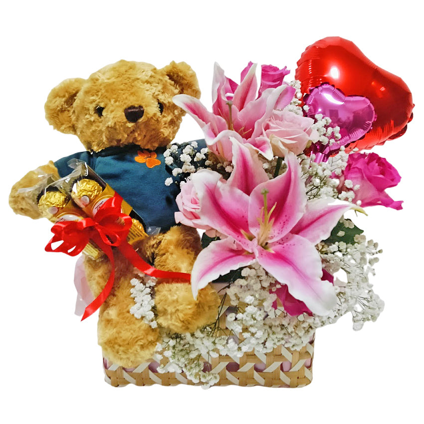 | Isi | 4 tangkai Roses Lily Hydrangea 2 Heart-Shaped Foil Balloons 1 Teddy Bear 6 Ferrero Rocher |