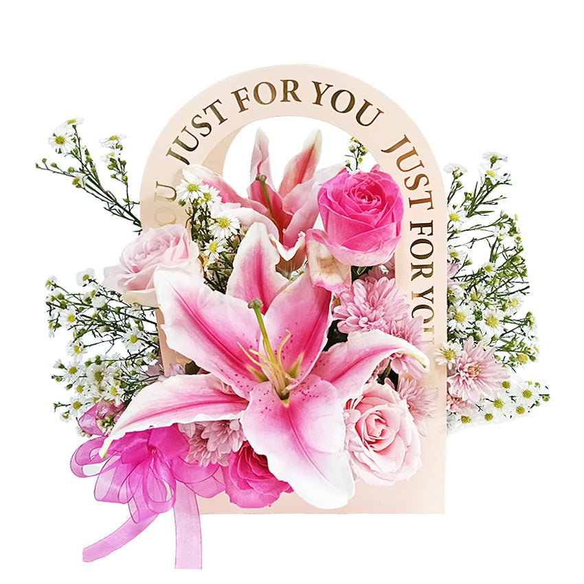 Berikan hadiah istimewa dengan Just For You Bouquet - Pink yang memukau hati. Bunga meja ini memadukan 4 tangkai Roses, Lily, Chrysanthemum, dan Peacock yang segar, menciptakan tampilan yang indah dan harmonis. Dirangkai dalam handy flower box yang praktis dan elegan, buket ini dihiasi pita satin untuk mempercantik tampilannya. Cocok untuk menghiasi meja atau sebagai hadiah spesial di hari Valentine dan momen penuh cinta lainnya!