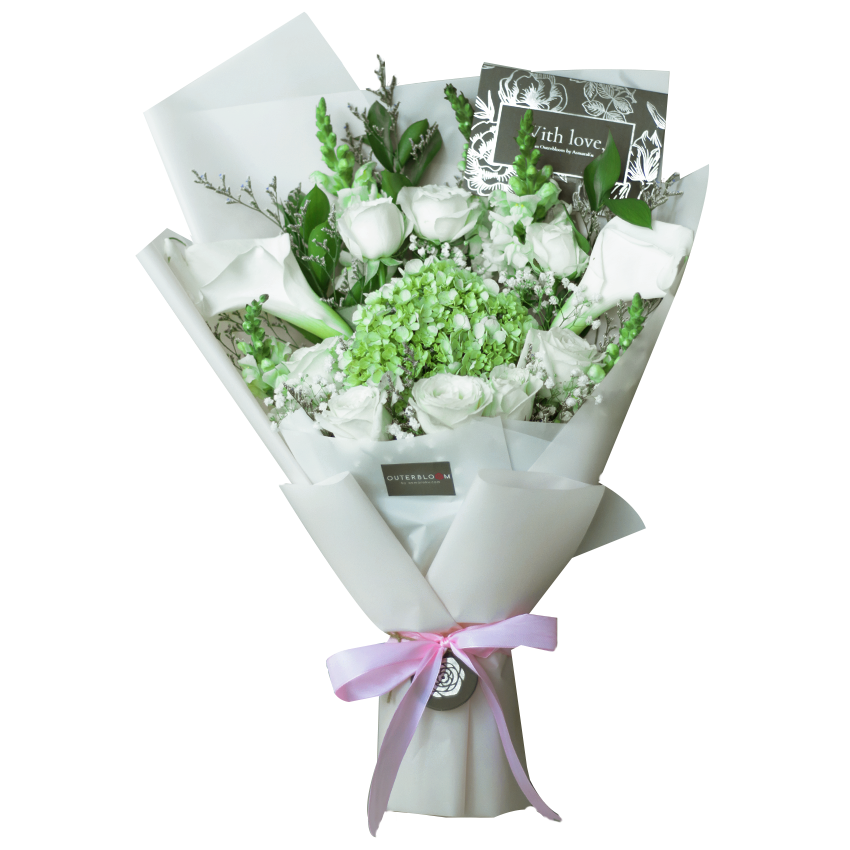 Romantic Universe Sweet Pink persembahan Outerbloom menghadirkan 8 Mawar Putih, 2 Lily, 3 Snap Dragon Putih, Hydrangea, Baby's Breath, dan Daun Ruskus. Dikemas dalam paper flower warna putih dan pink yang dipercantik dengan pita pink membuat buket bunga ini semakin terlihat manis.