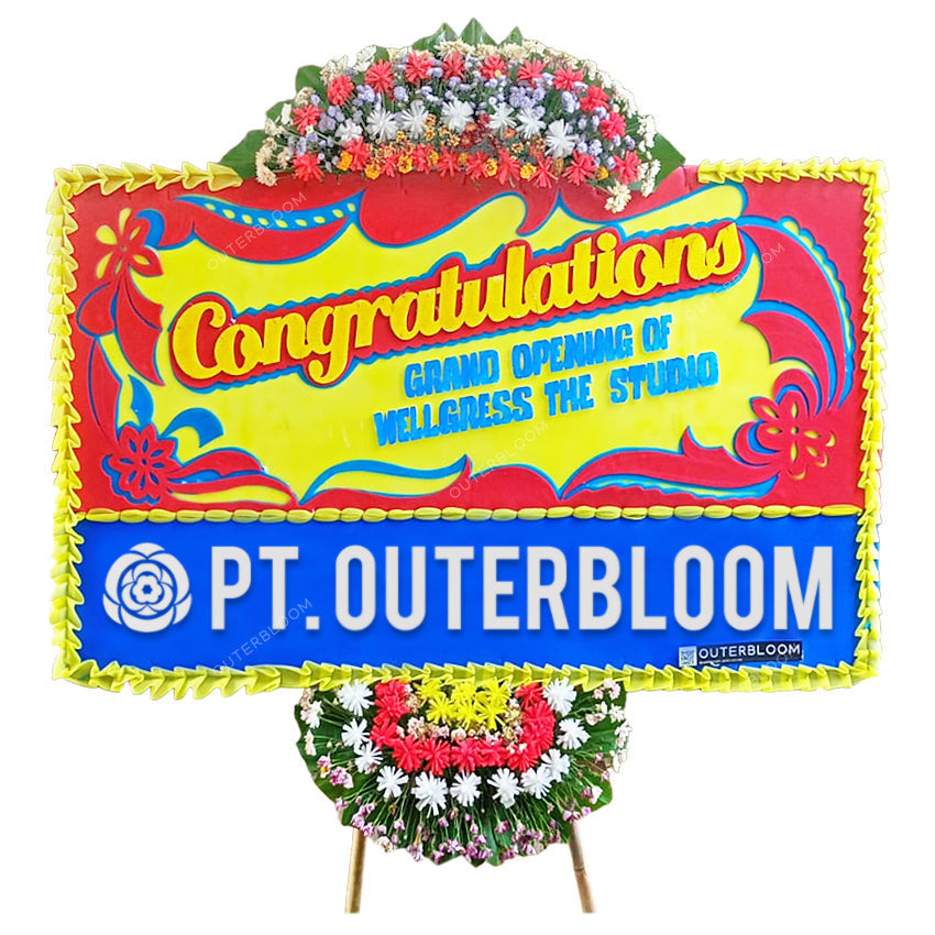 Papan Bunga ini cocok diberikan kepada kerabat atau rekan terdekat Anda yang sedang berbahagia. Tersedia dalam ukuran 200 cm x 125 cm. Hadir dengan varian rangkaian bunga fresh yang terletak di dua titik, yaitu: bagian atas dan bawah papan bunga. Pada bagian pinggir papan dikelilingi dengan list busa dan suyok berkualitas untuk menulis ucapan seperti "Congratulations".