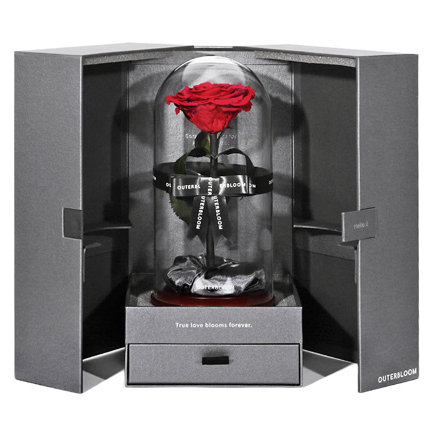Display Menawan dalam Borosilicate Glass Dome Eksklusif dengan Drawer Box Premium + Pita Satin Outerbloom